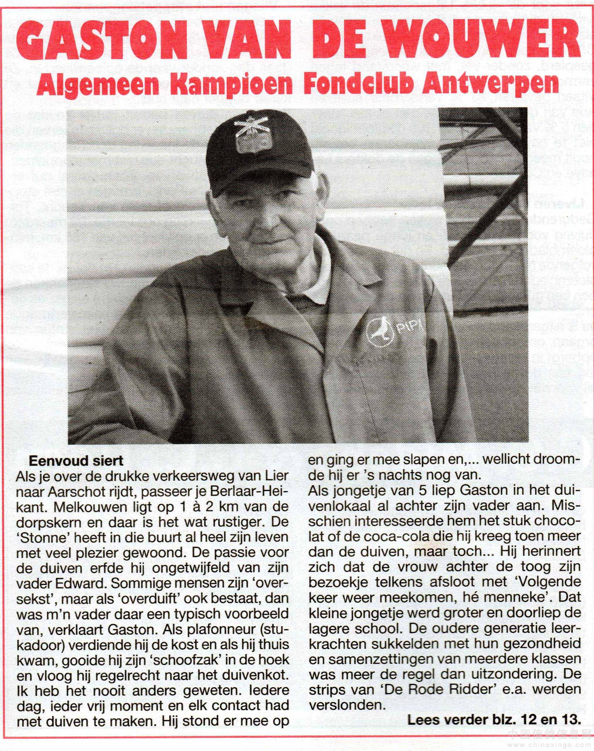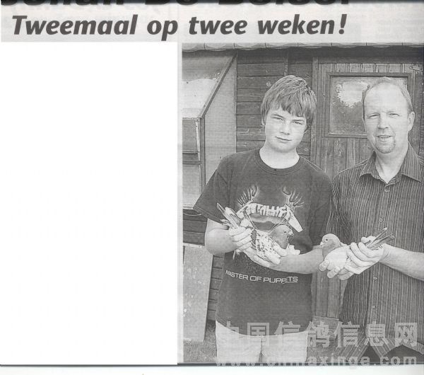 位于海纳省的哈奇斯·克利斯强(HARCHIES CHRISTIAN)获得老鸽组冠、亚军。位于安特卫普省的卡斯顿·凡德沃尔(VAN DE WOUWER GASTON)获得一岁组冠军,此鸽友实力非凡,同时为09年格瑞特幼鸽组全国冠军,今年5月12日比利时鸽报“De duif”为他作了一篇专题报导,笔者摘录其中精华,并联系几位在此次国家表现优异的鸽友,提供他们的优胜鸽的相关讯息,与诸位鸽友分享。
