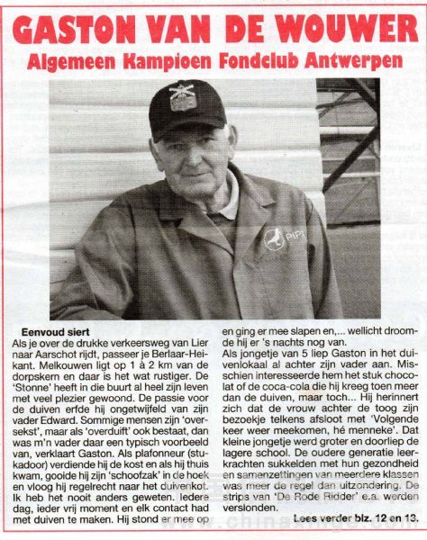 全国冠军:卡斯顿·凡德沃尔(Gaston),安特卫普一线中长距离老将强豪,近几年成绩更是可圈可点,成绩大把大把的都抓不住,典型老而弥辣!(Gaston5)09年所获得重要奖项一览表(全国赛绩、最佳鸽舍、鸽王)