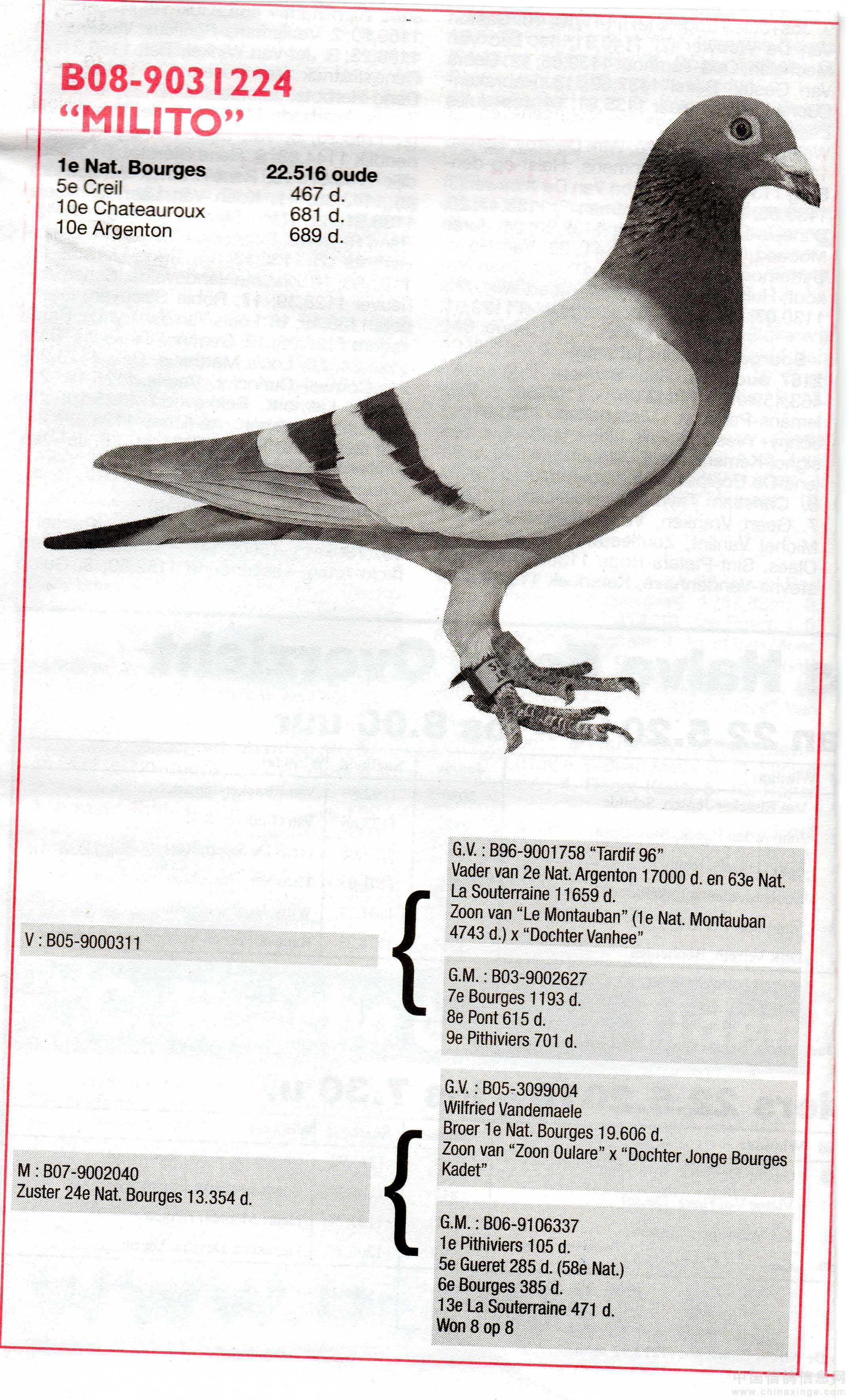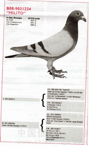 07-669查特卢省赛老鸽组冠军,1605羽,所有参赛4216羽最高分速,母亲为