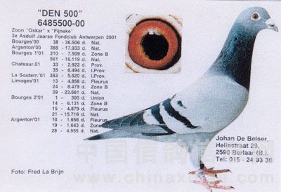 00-6485500 “Den 500号”,01年安特卫普联盟长距离鸽王3位,该舍最佳种鸽与选手鸽,鸽主当年申报奥林匹克代表鸽,选择项目失误,否则应该入赏长距离组冠军。