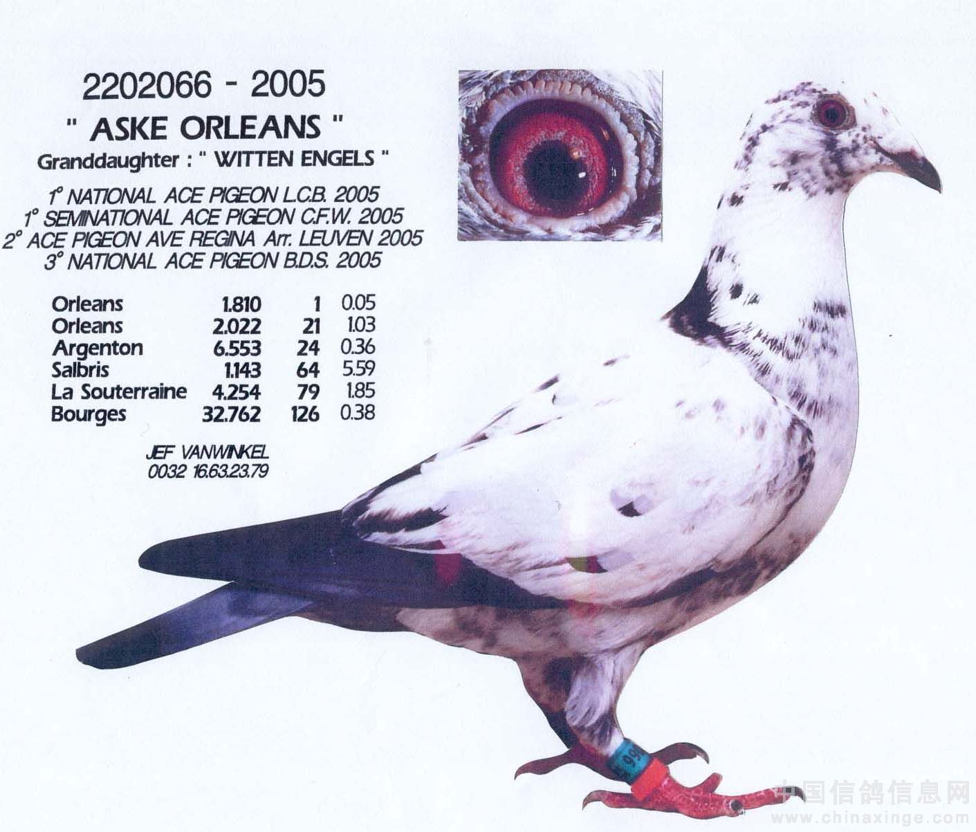 38位,波治全国87位,萨尔布里斯省赛4位 “全国信鸽讯息中心”幼鸽鸽王1位,LCB鸽报幼鸽鸽王1位,拜尔斯(比利时鸽粮厂商,赞助奖项)超级鸽波治+亚精顿