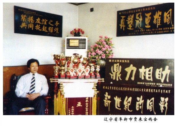 贾来宝丰宇鸽舍自96年建舍以来,97年秋季市会500公里第三名,辽宁省联赛17名直至2002年秋赛结束,从300至1000公里包括本棚和支援本市外市鸽友的种鸽;赛鸽直接参赛和作育后代参赛的共获冠军13个名次,亚军18个名次,季军13个名次,前十名48次,2002年秋季头一站300公里前一百名内一次就有16个名次。 现将几年来从300公里至1000公里大部分成绩鸽的奖杯;奖牌;奖旗和各……