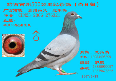 本人系黔西南州鸽协会会员,养信鸽80余羽,愿与广大鸽友交流。品系有詹森、雄风、克拉克、电脑等种鸽一批,在近几年的比赛中小有成绩如下:2007年500公里冠军、2008年500公里冠军。贵州省兴义市电话:0859-3226892手机:13984495399……