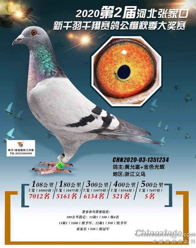 本人自幼喜欢养鸽,养狗,中间部队服役中断。 最新赛绩:新千羽千翔决赛5名,包头爱亚卡普决赛6名!山西翟武公棚决赛9名!!2010年秋开始起棚养鸽,获的10年秋天四关总冠军,360公里联合冠军,特比团体冠军,季军等!12年翟五决赛9名等。山西雁门顺峰公棚鸽王十位,千羽千翔决赛8名,翟武公棚决赛9名!内蒙威业公棚决赛27名,299名鸽王十位等!主血爱亚卡普指挥官,爱亚卡普詹森,苍白,盖比,林波儿,断胸骨等特别感谢张家口张继忠老师的大力支持。 微信快手同号:13473368008