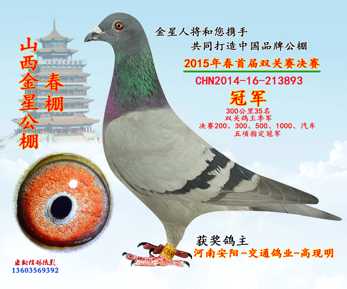 2012年开始养鸽,重金引进名家血统鸽,成绩鸽。通过科学的训养2013年就在工棚夺得高位名次数个。 2013年成绩: 河北涿州三义公棚决赛3名(指定鸽100.200.500元组亚军) 河北蓝天赛鸽公棚决赛11名。 北京蓝翔赛鸽公棚决赛90名。 郑州华远赛鸽公棚预赛29名,决赛27名(与预赛 29名同一羽,与蓝天决赛11名为同窝),61名。 2014年成绩: 2014年春山东大有赛鸽公棚决赛4名。 山东大有秋棚决赛102名。 北京聚来冠赛鸽公棚决赛35名。 北京国信达赛鸽公棚决赛33名(指定鸽500元组4名) 陕西西北国际赛鸽公棚预赛5名,决赛168名,296名(鸽王8名,同预赛5名为同一羽),392名,团体6名。 2015年春成绩: 秦皇岛云翼赛鸽公棚热身赛季军,决赛392名。 山西金星赛鸽公棚预赛35名,决赛冠军(与35名为同一羽)指定鸽200.300.500.1000元组冠军,汽车大奖赛冠军,鸽王季军。 2015年秋: 河南福华公棚决赛3名.60名.138名.492名、团体4名。 陕西大西北国际赛鸽工棚决赛159名,288名。 陕西西北天平赛鸽公棚决赛492名。 山西寿阳赛鸽公棚68名,227名。 北京国信达加强赛87名的好成绩。 更多成绩,后续更新。 联系电话:13700729582
