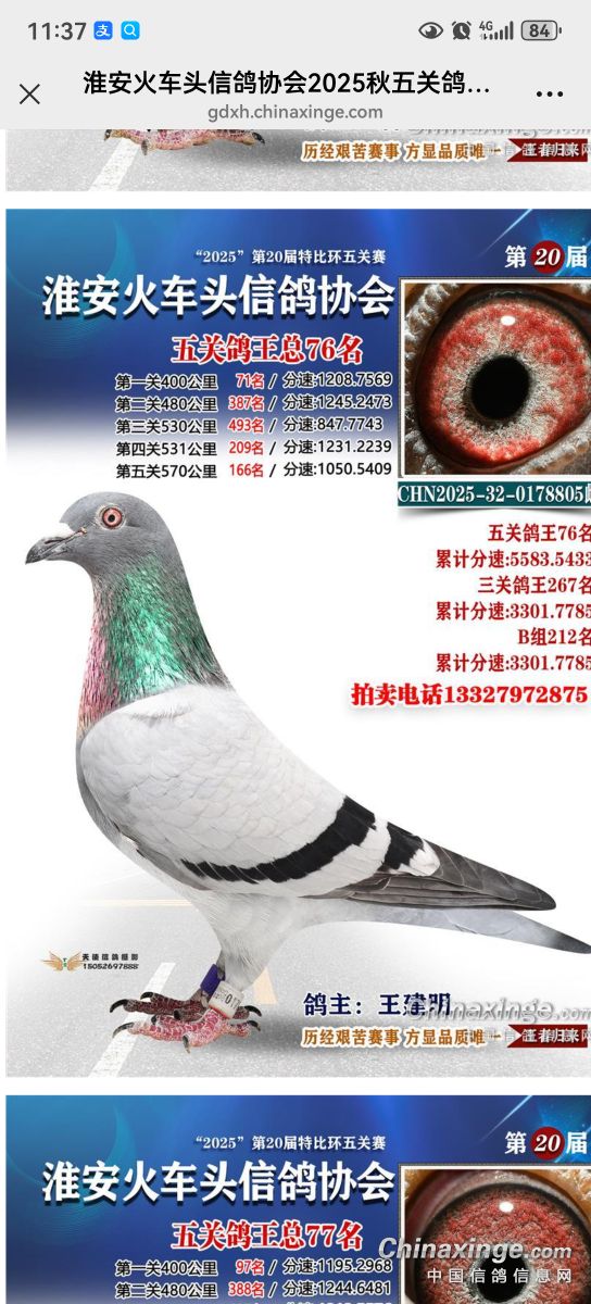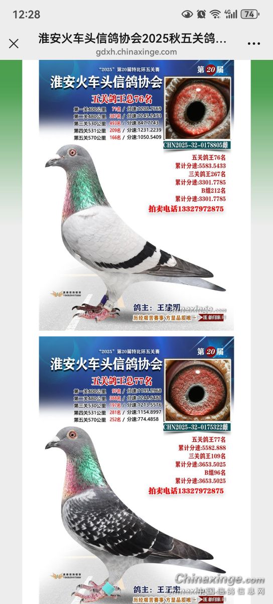 两只鸽子鸽王76名和张77名,五关分速就差0.45,我的第三关差一点,77名第五关差一点。