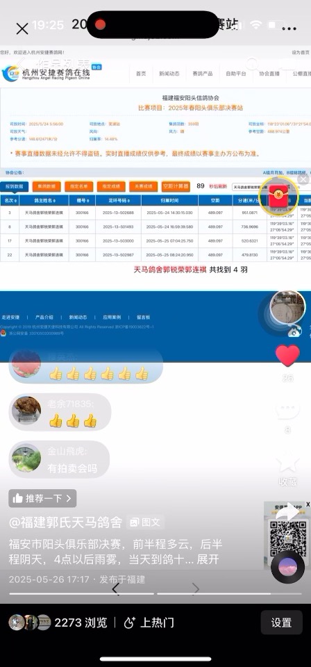福建海峡公棚决赛,天马658,在实时卫星定位直播上,近公棚150公里左右,一直是在前十的标注上,50公里在前5名,30公里前3名,感觉越飞越快,12-20公里,感觉有一个小停留还是拐个弯,在那个点大约兜了2分钟,(有鸽友说那天鼎城300公里,可能有鼎城鸽子一起给,所以绕了一下回来),总之有实时定位环,给了我们鸽主很多参考的资料!