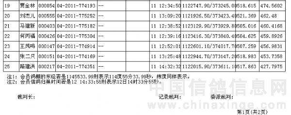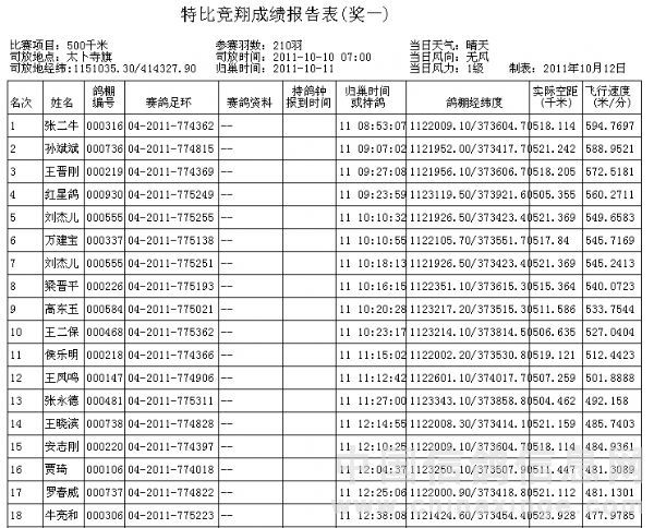 20111010徐沟信鸽协会500公里特比成绩表