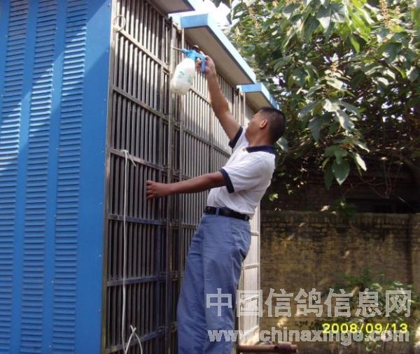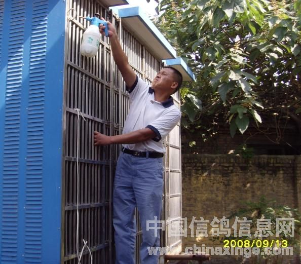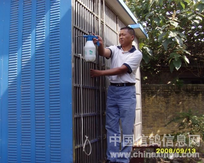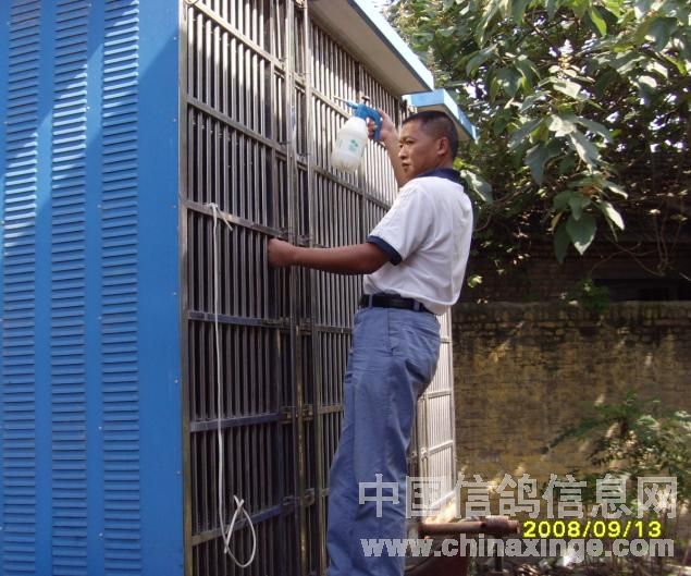 商丘市信鸽协会为了会员的利益,让赛鸽有-个健康的身体,在赛场上能发挥出好的成绩,把赛鸽笼严格进行消毒。