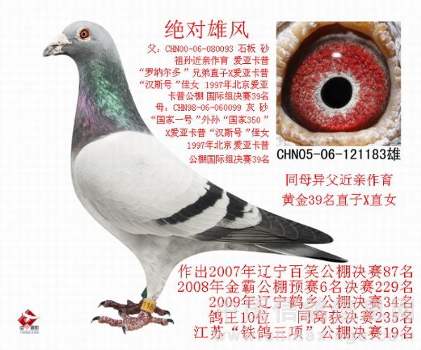 “皇城太子”本身是一羽优秀的赛鸽,在与一羽“迪布恩497”外孙女“金母2606”的结合后,更加体现了他作育的能力.不但如此,从这对种鸽身上又体现出几路血缘的融合性;因此,按着这个路思路,无论是哪两路结合都有过理想的结果,无论在哪个辈分上都会有满意成绩出现。在“皇城太子”这羽即是优秀赛鸽又是成功种鸽的身上,引发出了很多作育的思想。