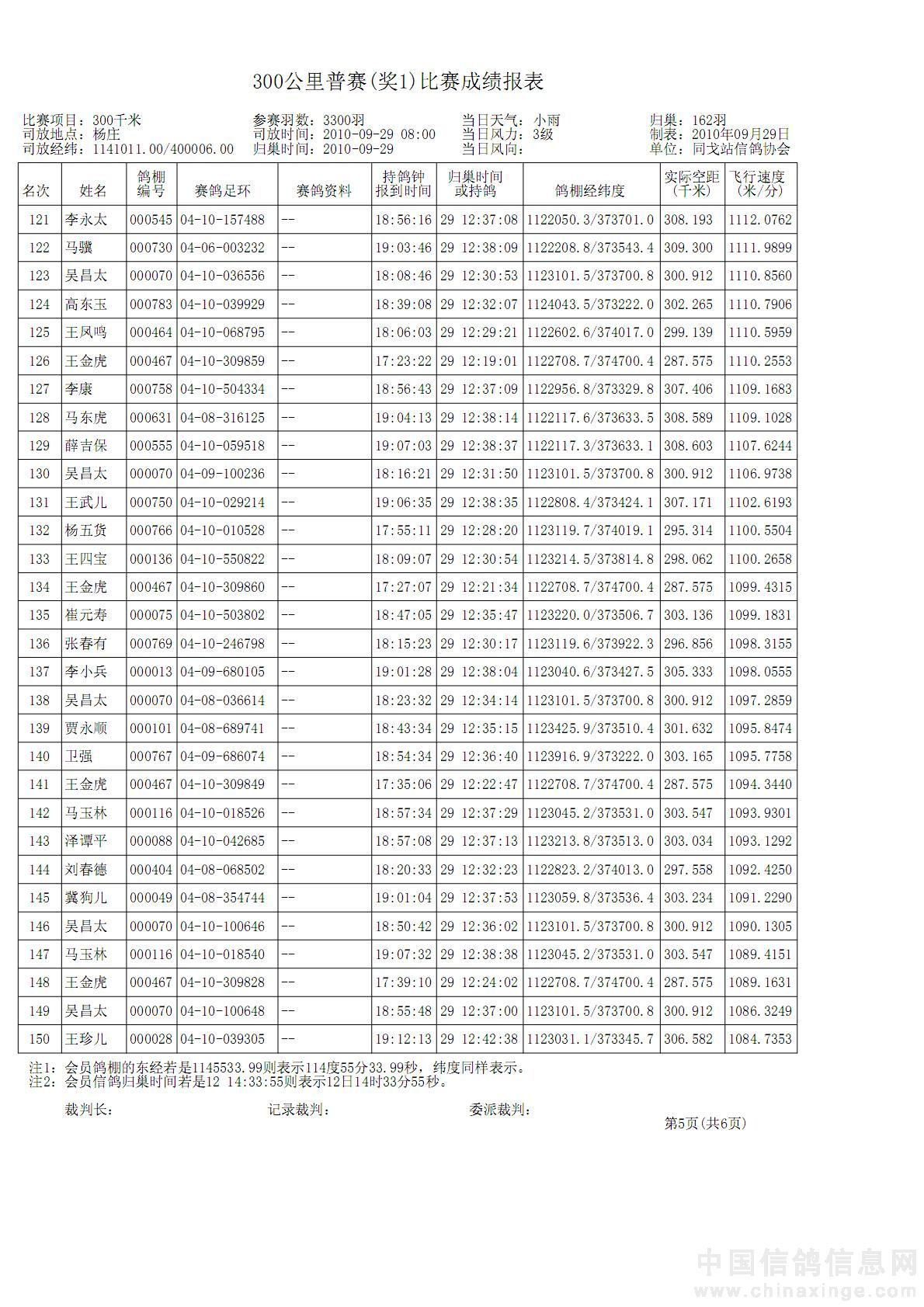 20100929同戈站300公里普赛正式成绩表
