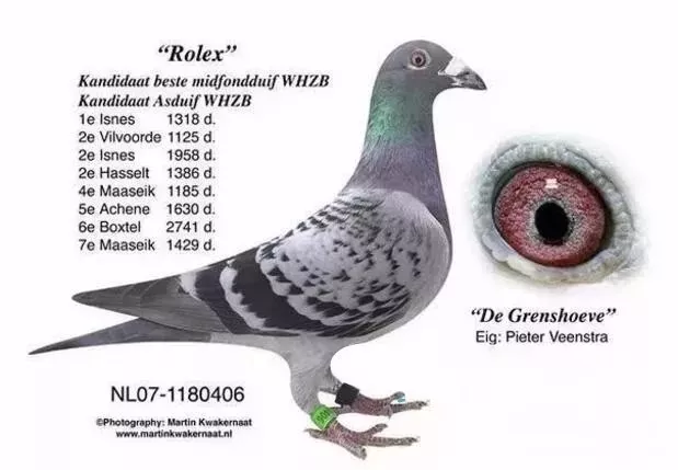 “劳力士(Rolex)”是“金翼(Golden Wing)”的直子,这只出色的雄鸽赢过8次冠军