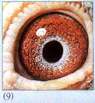(9) 标准的现代欧洲混合种上品鸽眼。用国人的话,"干、老、清、亮、活",也达到要求。如果我国鸽界的消费者和经营们都能按这个起码的眼志标准掏钱买鸽,并且长期坚持下去我想国际名家即使很想赚钱怕也拿不出多少货来。这种眼志类型,在全年湿度小、气候变化较有规律的北方平原大地,无论作种还是出赛,可资判断的系数都非常高,使用成功率一般也高于同档水准的黄眼。国内外各种长短品种鸽都有此类眼型,但以纯种近亲的詹森系最值得信赖。初养小鸽友,应以观察后代总是育不出黄眼的为上选。