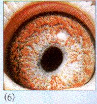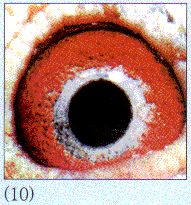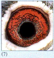 (6) 乍一看,以为是幼鸽眼,其实却是12岁老雄的心智之窗。与(4)号、(5)号眼不同的是,"节节后退"的面砂,仍削弱不了其强壮的眼志,环状纹眼志圈内,条条距离线流苏毕现,加之收放敏捷的瞳孔,抖动频密的眼球,显示出品种纯正、根基深厚的血缘背景。此眼国内外速度型鸽种较多,比赛逢好天放出,常有惊人的表现!詹森、彼波曼、林波尔等见多。忌选大瞳孔。宜择嘴角至嘴尖喙处由白渐黑者。