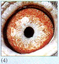 (4) "眼志与底砂融为一体,是高级的眼志类别之一"。此眼即是。这种类型,发生在黄眼中况且常见,但砂眼绝对是1:10的罕有!再配合小瞳孔和一条条"红丝虫"争先恐后游向"潭心",真是妙不可言。这是一种在眼睛中就能明显看出潜藏着已固定了的遗传基因,并已完成高度进化过程的鸽子。以淡斑詹森(特别是极近亲个体)为最大宗。以此为种,10年不忧!