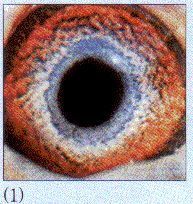 (3) 像一块蓝布垫底,然后再编织上一层镂空疏透的粗红绒。鸽龄越大,接近中心圆的红绒越渐散开。故眼志给人没有圈环的感觉,其形状尤如国画中的泼墨,或是由绒砂的随意松散来决定的。此眼志一枝独秀,深不可测。眼志范围但有黑色素渗入的,则品质大打折扣,血缘来历更值得怀疑。英国鸽种,以及小鼻、方头、浅羽、红羽类型,为上选。