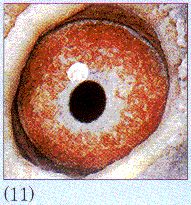 (11) 为具有超前意识的鸽主所喜爱。虽然它与(4)号鸽眼很相似,但完整的眼志圈环仍依稀可见,面砂基本也未散开,是进化到(4)号鸽眼的中间过渡形态。属于高等级鸽眼,适合山区、霏雨、浓雾等条件艰苦的地区的鸽友使用。性缓、晚熟。羽色宜选深浓偏暗、嘴喙同时选琥珀色的为佳。忌白眉、白腰、白档;忌黄、红眼皮。此眼择配面广,与好的黄眼相交,常能轻易作出目光犀利、漂亮非凡的好东西。常见于凡布利安娜、安德烈勃默脱、卡得利斯、美国戈登、日本岩田、势山、中国李祖光赛扬。多出自两羽黄眼近亲翻出。