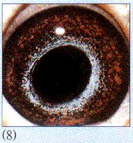 (8) 用"绿眼志在砂眼中的翻版"来形容这种眼志,比较接近。事实上,它也多从绿眼志来,也可再育出绿眼志。深浓、艳丽、黑气四溢、蓝光闪闪,让人观后禁不住屏住呼吸。但好看归好看,育种价值却远较商业价值逊色很多。尤其当此眼为夹白条者,育出直代并不见得比普通砂眼眼种鸽强多少。故适合作基础源头鸽使用。然而万事总有例外,此眼若长在一羽银灰雌鸽身上,或者恰巧是个小瞳孔的随便什么羽色鸽身上,以此压棚镇舍,则一夫当关,万夫莫开!主人如用不出则非鸽蠢矣。