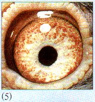 (5) 典型的白眼志!圈环湮没在白底之中隐约露出轮廓。面砂色褪、稀疏、后撤,就像经年被海水冲刷后班驳陆离的孤礁,突兀、团簇,可无可有。此眼幼年期反见深暗,3岁或出赛后会突然变得苍白,好象生病一样。此眼看似退化,实情则是浓血见证。它是砂眼类中高级别的育种眼!与"苍白无力"正好相反,育出后代弹无虚发。日本关口西翁、国内杨登元西翁,以及詹森本系,常有此惊喜发现。