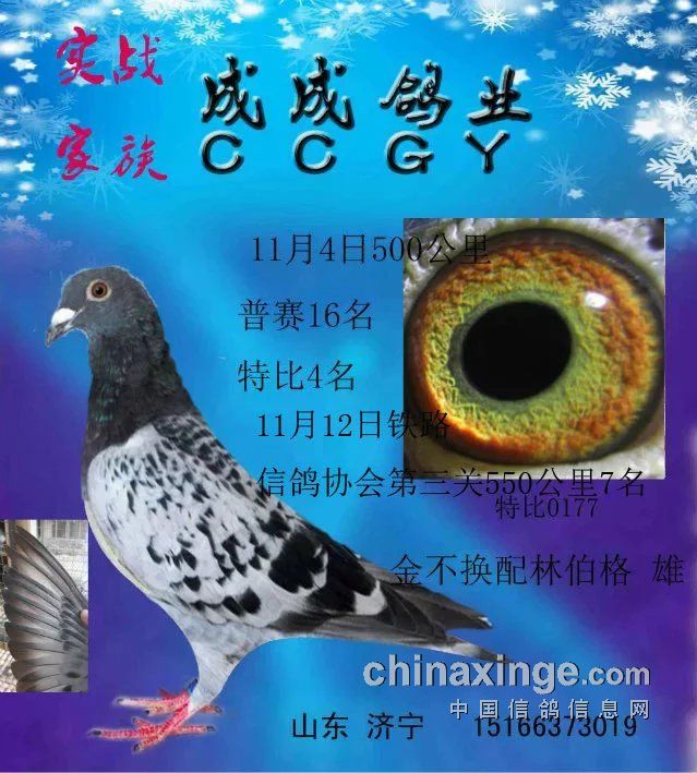 11月12日,铁路信鸽协会的550公里比赛正式打响,我的爱鸽000177不负期望,早早归来,而且还是唯一的一只指定鸽。但可怕的一幕出现了,12点30归巢,却怎么都不进棚,想尽一切办法,才用水做诱饵,在棚外用网子扣住,完成录时,这时已经是1点17分了。心里知道,前高位没希望了,毕竟耽误时间太久。可喜的是,成绩出来,竟然排了7名,而且以微弱优势还赢了指定一把抓冠军。下面这只就是痛失冠军却赢得指定一把抓的冤家。