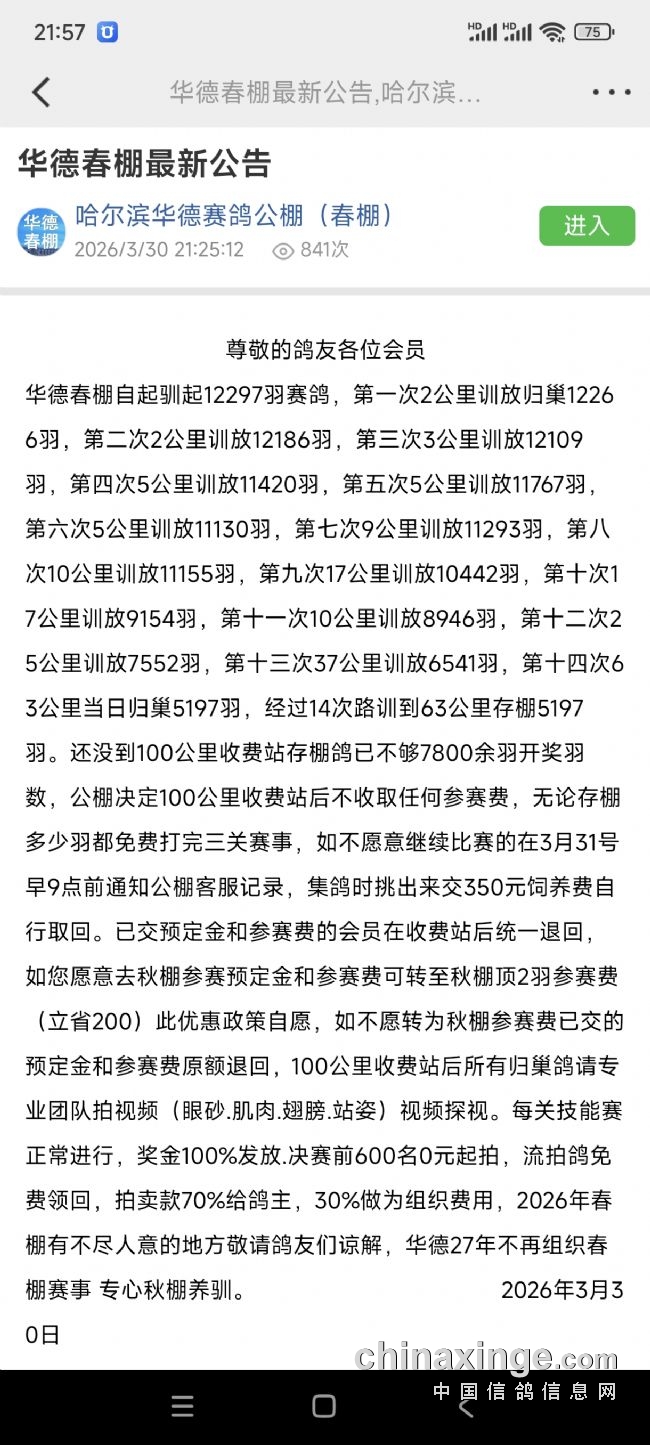 继昨天《黑龙江又一春季公棚63公里遭遇滑铁卢,存棚羽数低于6500羽开奖羽数!》之后,华德春棚决定100公里收费站后不收取任何参赛费,无论存棚多少羽都免费打完三关赛事,如不愿意继续比赛的在3月31号早9点前通知公棚客服记录,集鸽时挑出来交350元饲养费自行取回。已交预定金和参赛费的会员在收费站后统一退回如您愿意去秋棚参赛预定金和参赛费可转至秋棚顶2羽参赛费(立省200)此优惠政策自愿,如不愿转为秋棚参赛费已交的预定金和参赛费原额退回,100公里收费站后所有归巢鸽请专业团队拍视频(眼砂.肌肉.翅膀.站姿)视频探视。每关技能赛正常进行,奖金100%发放.决赛前600名0元起拍,流拍鸽免费领回,拍卖款70%给鸽主,30%做为组织费用,2026年春棚有不尽人意的地方敬请鸽友们谅解,华德27年不再组织春棚赛事专心秋棚养驯。