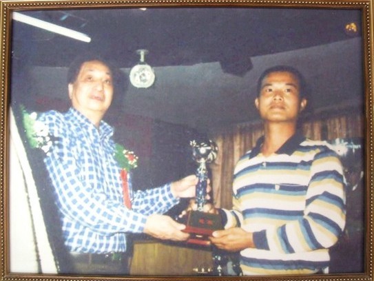 <--台湾周逸年会长赠奖杯并给本人颁奖