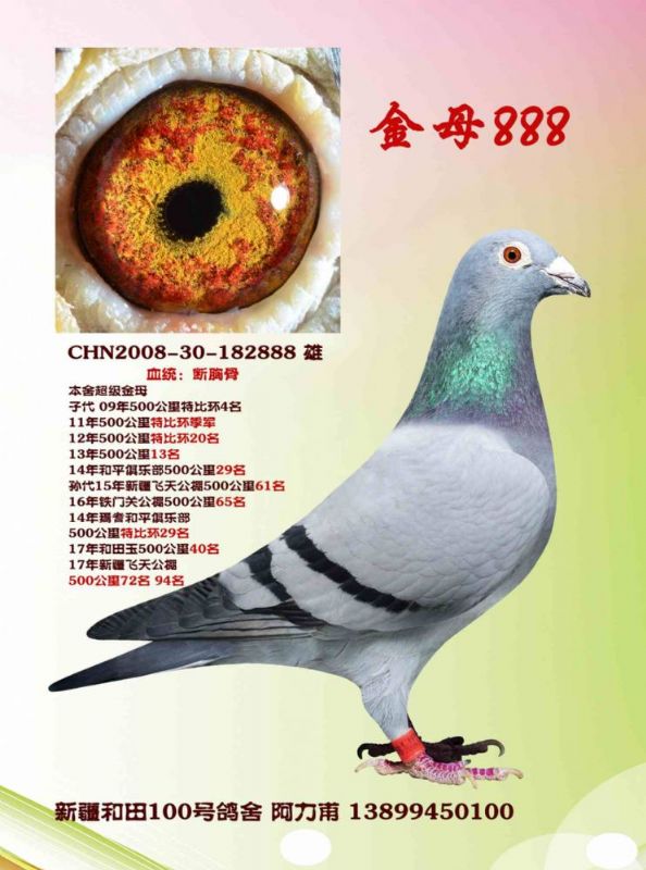本人是大学哲学副教授,我从小学就喜欢鸽子1993年大学毕业以后开始养信鸽,1995开始参加和田地区信鸽比赛,本鸽舍共有30多羽原环种鸽,1996年到2018年和田地区和新疆各地公棚赛中300公里到830公里获得了13次冠军,前100名内200多次。 和田100号种鸽舍主血是五大世界名血信鸽:詹森断胸骨,桑杰士,杨登远西翁,东方不败,凡龙,我的养鸽理念是:最好的纯血种鸽配最好的赛鸽培养出优秀的赛鸽和纯种的近亲种鸽,没有最好的纯种种鸽你永远做不了天上的星星而且养出赛绩不稳定的一群鸽子。 1)詹森断胸骨:血统纯度高,遗传性强,别的血系融合性特别好,羽色:灰和石板灰为主稳定为主的速度型信鸽,无论是地方赛或者公棚赛表现的特别出色,是一个养鸽家一生中难以找到的黄金血系,飞行距离200公里至700公里,最好的公棚赛专家。 2)桑杰士:血统纯度高,遗传性强,别的血系融合性特别好,稳定为主的速度型信鸽,羽色:瓦灰和铁灰为主,无论是地方赛或者公棚赛表现的特别出色,是一个公棚赛手的第一个选择,飞行距离300公里至700公里,公棚赛获得最好最多名次的好的血统鸽。 3)杨登元西翁:中国国血四大名血鸽之一,国宝级的血统鸽,养鸽20几年当中全疆纯度最好的西翁鸽在本鸽舍保留,遗传性强,早熟,稳定,速度快,新疆赛区300-500-700公里多次获得过分速冠军有西翁血统,羽色:红雨点和降为主,无论是地方赛或者公棚赛表现的特别出色,是一个养鸽家难以找到的国血系,飞行距离300公里至1000公里,越杂交越能发挥的赛鸽名将。 4)东方不败(桑杰士),血统纯,速度快,早熟,羽色灰为主 (黄眼稳定为主,沙眼速度为主)和田地区和全疆各地各项地方赛和公棚赛选送的最好一路品系。 5)凡龙:本舍凡龙血系鸽子有两路:1)罗伊斯凡龙:手感好,骨架硬,溶血性好,速度快,羽色;雨点为主,飞行距离300-600公里,2)爱亚卡普凡龙:手感好偏长,骨架硬,溶血性好,耐力性特好,羽色;雨点或麒麟花主,当年幼鸽能飞行距离300-800公里,越远越善飞。 只有好种鸽,才能出好赛鸽, 只有好赛鸽,才能拿冠军! 《你爱鸽子像爱孩子一样,鸽子也会像爱父母一样回报你》
