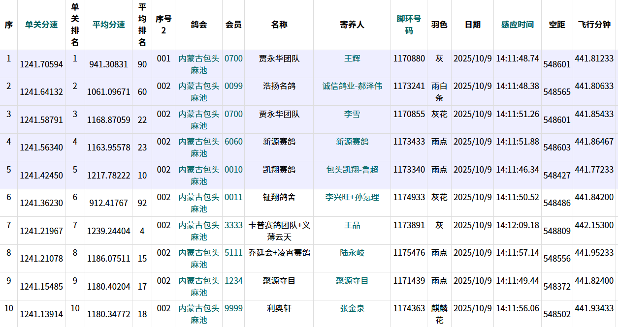 下午14时11分48秒,冠亚军几乎同时归巢。冠军鸽环号1170880,鸽主为贾永华团队鸽友王辉,分速1241.70594米/分,空距548.601公里。亚军鸽环号1173241,鸽主为浩扬名鸽团队诚信鸽业-郝泽伟鸽友,赛鸽分速1241.64132米/分,空距548.565公里。