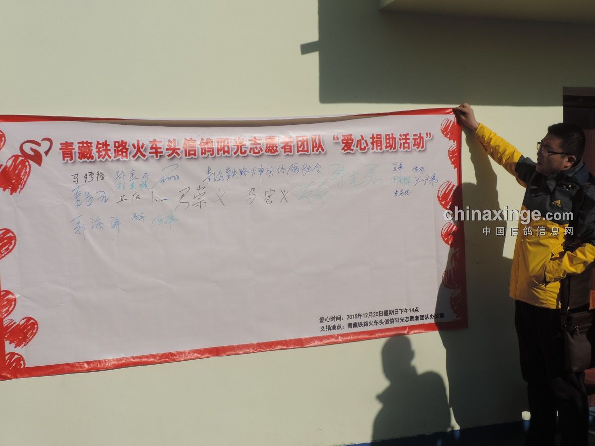 一直以来鸽子作为和平使者的象征备受人们的喜爱,可眼下养鸽扰民,违规搭建鸽棚的报道不时出现在媒体网络上,引发全民关注和热议,为弘扬中国传统美德,展现高原养鸽人的博爱之心,向社会传递养鸽人的正能量,由西宁“非赢不可”微信鸽友群发起,经青藏铁路信鸽协会授权,在鸽友马德福先生资助下的青藏铁路火车头信鸽阳光志愿者团队今天在西宁举行了成立仪式。志愿者团队以信鸽为载体,以信鸽比赛及个人募捐为契机筹集爱心经费,以用真情铸就希望,用爱心孕育生命为宗旨来帮助那些需要帮助的人。在成立仪式上首次共筹得善款11150元,已全额交到患病鸽友家属的手里,用于后期治疗所需。也许这只是高额医药费的冰山一角,但却浓缩着我们对鸽友的爱,对他的祝福。而与此同时,我们更希望有善心的社会群体站出来帮助需要帮助的人度过难关。
