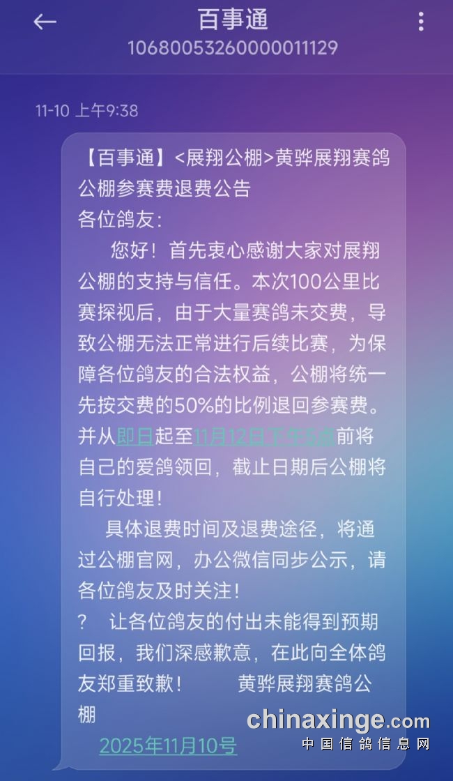 全国鸽友肯定有好多被黄骅展翔赛鸽公棚坑骗的,虽然路途遥远,不能亲力亲为去跟进案件进展,但是绝对不会就此罢休,不了了之。无耻之徒虽远必诛!