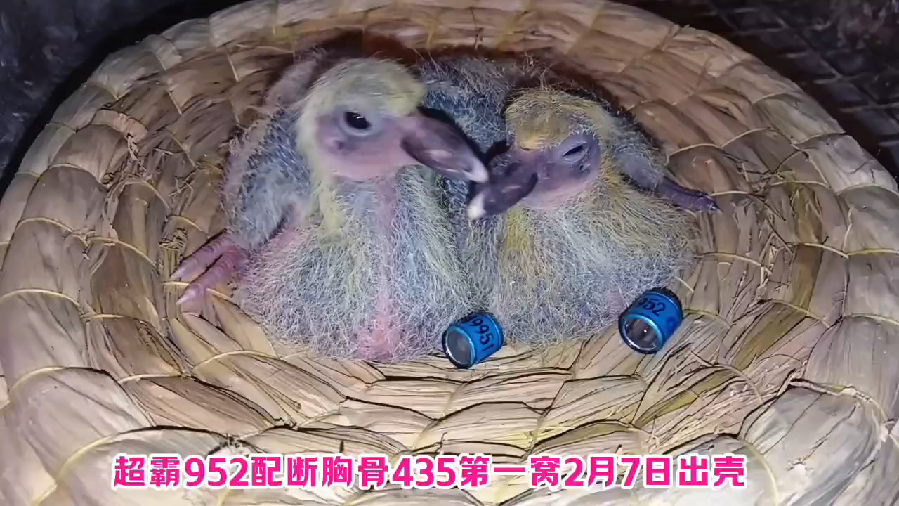 配对六超霸952配断胸骨435第一窝2月7日出壳,昨天2月13日套环951-952,暂时看952双翅有白条,不知道951是纯雨点还是纯瓦灰,或许会有一丁点白盖羽。