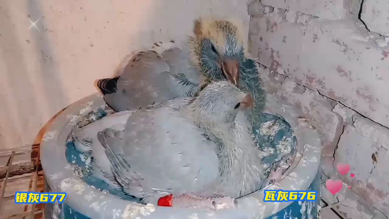 儿子瓦灰配瓦灰今年第一窝出了一灰一银灰,老子今年第二窝也是瓦灰配瓦灰出了一灰一银灰。 视频中配对是超霸194ⅹ公棚三关鸽王第七名,它们去年也曾作出过一羽银灰雄鸽,但总感觉还是出的瓦灰打比赛给力。 鸽友们·早上好!