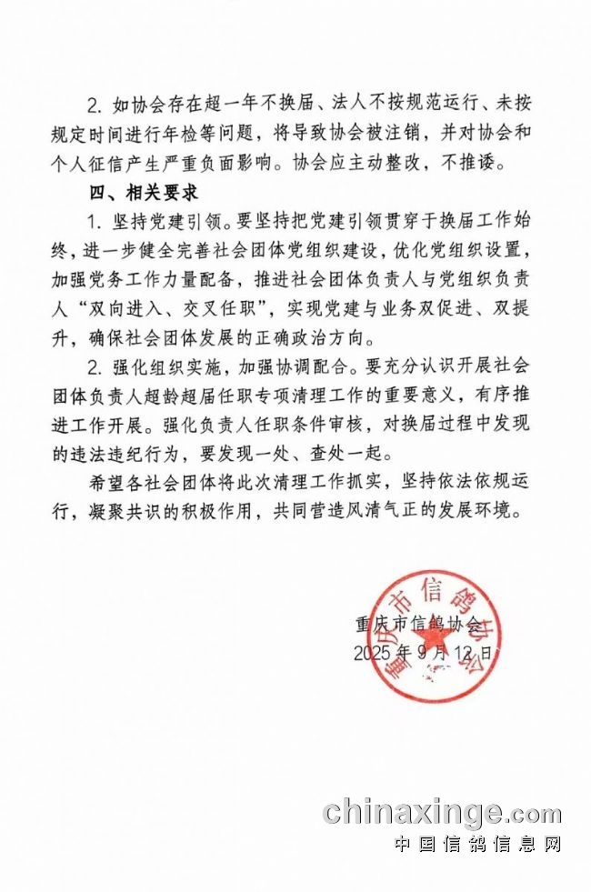 重庆市鸽协转达《关于全市性社会团体超龄超届任职专项清理工作的通知》
