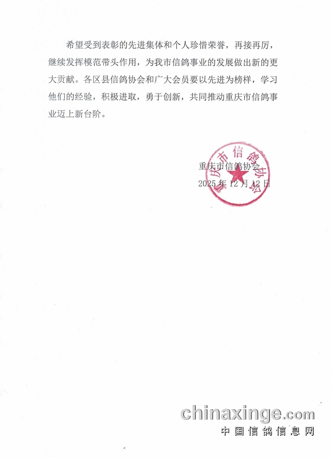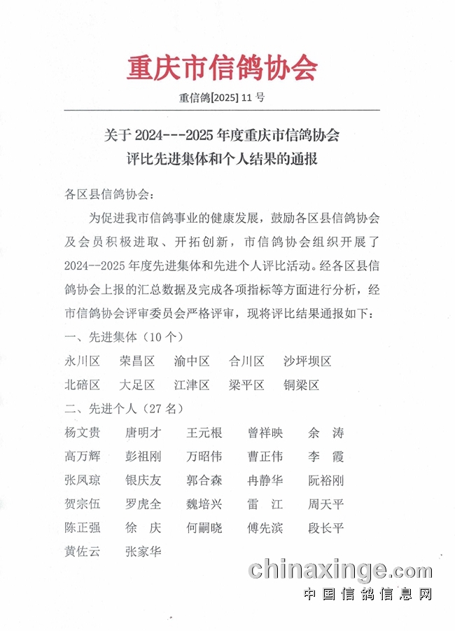 重庆市信鸽协会关于表彰2024-2025年度先进集