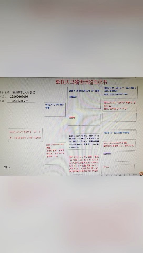 天马038,父亲天马765“天马传承之子”,母亲天马601“天马传承女儿”近亲鸽! 原价2000,按昨天和鸽友的约定800分享给需要的鸽友!以谁先付款,归谁原则! 郭氏天马鸽舍的每一羽鸽子都支持DNA鉴定