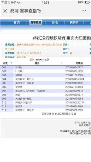 祝贺泉州江树波鸽友在赛鸽上青出于蓝而胜于蓝,亲自作育的郭氏天马近亲鸽在重庆大联盟公棚入赏310名及300元组大家乐成绩,一窝两羽参赛两羽进入决赛!成为同组里唯一决赛入赏成绩鸽,今年重庆公棚算失利了。没有达到预期的目标!让一同参加大联盟的鸽友失望了。想想赛鸽有时真的是水无常形,兵无常态,赛鸽报着包飞成绩的心态和包赢的思想,那么赛鸽爱好就变成一种压力包袱!真心祝愿好朋友兄弟们都能在赛场上一帆风顺飞成绩!