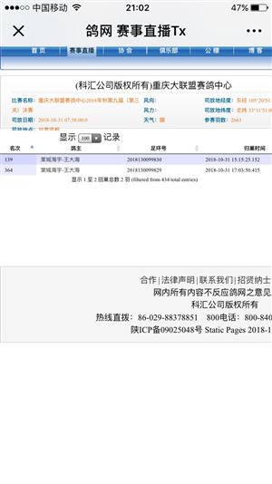 祝贺 棠城海宇王大海名下郭氏天马鸽舍作育的赛鸽,在2018年10月31日重庆大联盟公棚决赛入赏139名,364名。200元组出门点第27位、第75位,大家乐300元第73位、第265位 大家乐第38位,第97位,300元精英赛第28位 500元精英赛第13位,300元十取一第30位,500元十取一第15位,1000元组十取一第5位,500元二十取一第9位,聚宝盆第23位,第50位(4羽缴费3羽进入决赛!祝愿好兄弟成绩越飞越好!