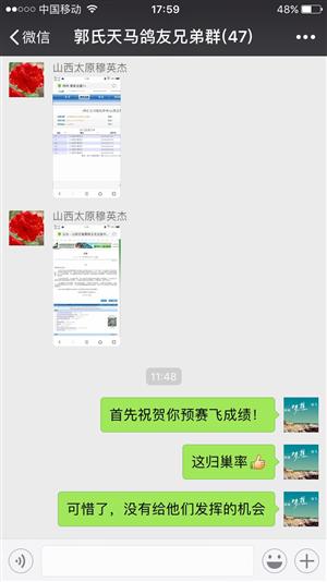 穆英杰自己作育的郭氏天马第二代第三代很争气,在山西正翔赛鸽交流中心艰难低归巢的预赛中入赏34名,八羽参赛六羽回来。因为归巢率太低,公棚改规程,决赛不放了。公棚不守信用,对于拼死回来的赛鸽不公平!这样的公棚鸽友送鸽参赛没有意义!
