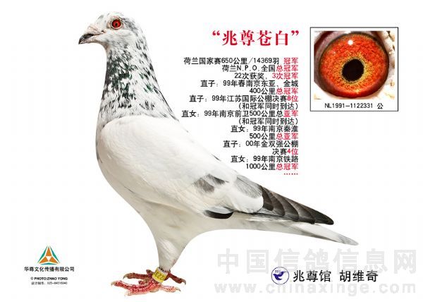 可能很多鸽友从第三个提示中就能答出是哪羽鸽子。它就是大名鼎鼎的苍白骑士。苍白骑士NL91-1122331白麒麟花黄眼雄鸽,本身获荷兰国家赛14369羽650公里冠军;NPO全国冠军;22次获奖;其中3次冠军作为种鸽,苍白骑士直子、直孙以及直系下代所获冠军超过200次。前10名成绩无法统计,苍白骑士的遗传十分优良,它的羽色呈显性遗传,以麒麟花色为主,眼砂以橙黄眼为显性特征。苍白骑士血系交配詹森系、杨•各多拉斯系、威廉吉尔特系、范内系、西佛托依系、薛仲雅系、乔斯托内系,作出下代都能获奖,苍白骑士血系溶血性非常好,无论是杂交配,还是近亲回血交配都能作出冠军鸽,苍白骑士血系已经发挥至第6代。