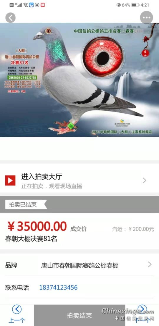 春潮三关鸽王9 拍卖会结束,接小鸟回家