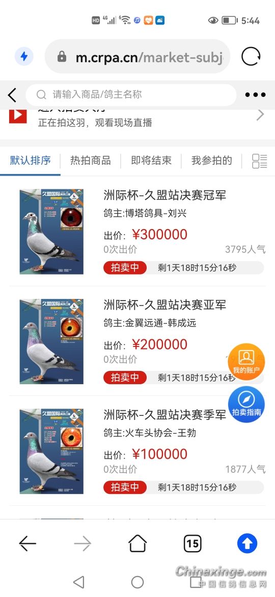 拍卖时间:4月19日-20日 (王博士获季军) 拍卖顺序:4月19日400名-冠军 ??????????4月20日401名-800名 ??? 奖鸽赏析:久盟首届决赛奖鸽照片 http://gdgp0.chinaxinge.com/style/mo10/huojiang_list.asp?gp_id=2369&id=2745