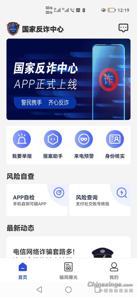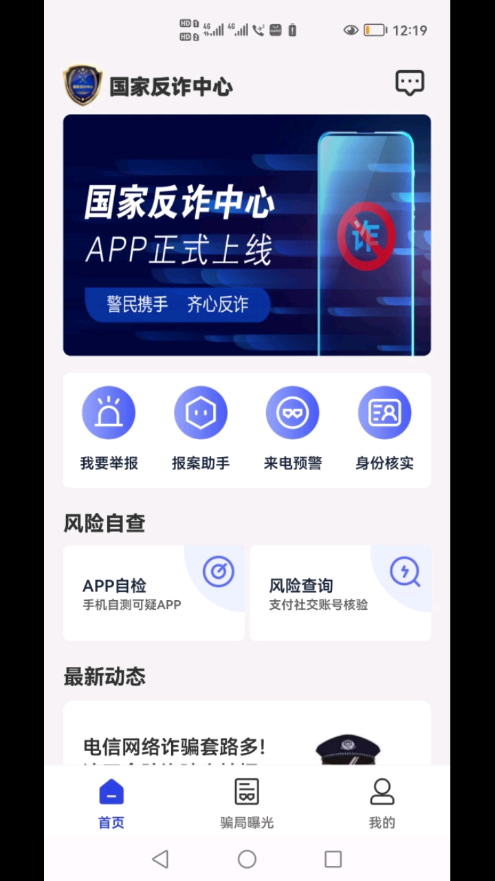 国家反诈中心 国家反诈中心 APP 正式上线 警民携手 齐心反诈 我要举报 报案助手 来电预警 身份核实 风险自查 APP 自检 风险查询 手机自测可疑 APP 支付社交账号核验 最新动态 电信网络诈骗套路多! 首页 骗局曝光 我的