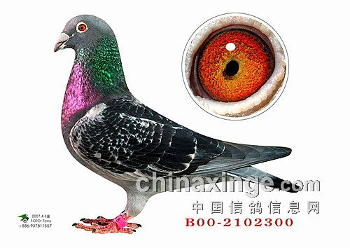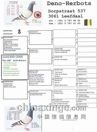 名鸽专集5当中,迪诺.贺伯特的Bonny邦尼B00-2102039斑♂,而Bonny为B96-2167081闪电号的同父弟鸽。连同其本身共有三羽同父母兄弟鸽,而本舍引进其中二羽——邦尼及其全兄弟300号。