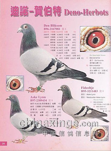 2008年成绩为:2008年K.B.D.B中距离鸽王全国总冠军B07-2103094 GINA.作翔:JOS DENO (迪诺、贺伯特联合鸽舍)