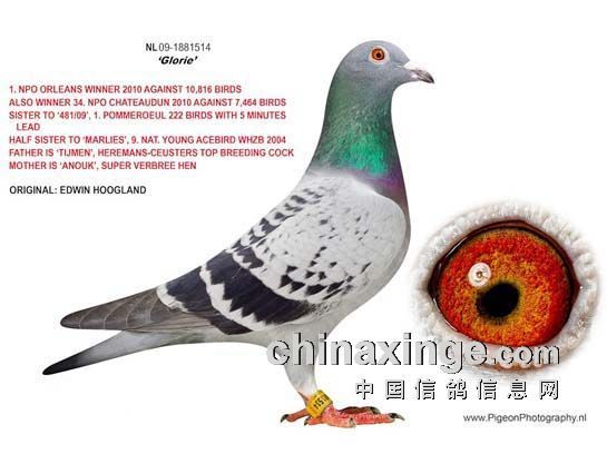 2010年奥尔良NPO全国10816羽冠军 2010年查特顿NPO全国7464羽34名 米尔3417羽13名 贝罗尼1514羽18名 道夫尔6491羽26名 贝罗尼1487羽27名 波玛罗3054羽30名 出自利奥-贺尔曼斯鸽舍“欧元号”兄弟+“奥林匹克 03”直女 全兄弟(姐妹)“481/09号”荣获: 波玛罗222羽冠军(领先亚军5分钟) 波玛罗1827羽亚军 波玛罗6211羽8位 同母半姐妹“玛莉丝”荣获: 2004年荷兰WHZB全国幼鸽鸽王9位 尼尔尼斯2190羽季军 翔特利11201羽10位 奥尔良4482羽35位 史栋贝克2209羽52位