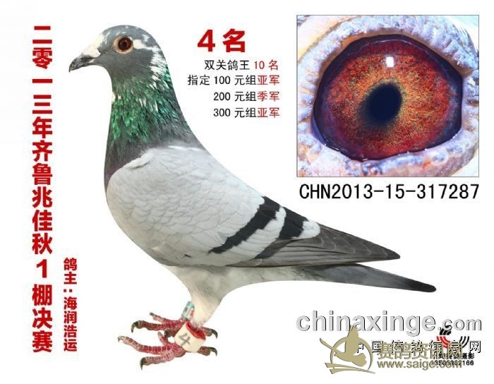 山东省淄博市:QQ178425300 电话:13964382449 主血统:幕利门、詹森火箭、桑杰士、东方快车、波治、小龙女。 公棚赛 预赛:亚军\14名\30名、60名、114名等 决赛:4名、9名、10名、25名、32名\55名\60名\66名、67名\82名\98名、99名、137名、\151名、160名、161名、179名等。 三关鸽王9名、双关鸽王10名、17名。 鸽会比赛: 300公里10名\21名34名\55名等 400公里12名\16名\19名\21名\22名\29名\30名55名等 500公里季军、5名、7名、\10名\22名\30名\42名\44名\55名\等 田和堂俱乐部三关鸽王4名、7名、9名;三关鸽王4名、三关鸽王7名、四关鸽王11名等; 300公里指定鸽季军,400公里指定鸽冠军两个等 我养鸽子总数一直控制在40羽以下,走的是少而精的道路. 近几年成绩: 2010年济南国际决赛9名,放5归四,小团体亚军。 2012年兆佳春棚双关鸽王17名,团体18名。 2012年秋季兆佳秋1棚99名三关鸽王9名、161名。 2013年齐鲁兆佳秋1棚殿军、鸽王10名,372名,指定100元亚军、200元亚军、300元亚军。 2014年春季鸽会300公里70名,450公里75名,500公里漯河9名,550公里21名,四关鸽王11名。 2014年兆佳秋1棚决赛97名。300公里曹县24名68名,500公里阜阳50名60名,三关鸽王16名,齐盛俱乐部61名。 2015年春季齐盛400公里团体29名。三关鸽王23名41名,500公里90名 桓台县信鸽协会参赛10羽,300公里团体亚军,5名7名44名45名51名57名92名99名128名206名。400公里参赛10羽59名93名95名105名111名125名150名209名304名。500公里18名22名41名42名65名164名。三关 2015年兆佳春二棚决赛66名。 2015年兆佳秋1棚预赛28名,决赛211名,三关鸽名王18名,鸽会300公里放3羽定陶52名117名,500公里放3羽阜阳8名49名,齐盛俱乐部放3羽400公里206名532名694名县排名43名;500公里阜阳放3羽159名186名,县排名45名