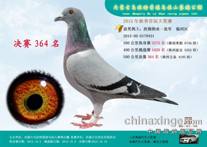 2015年本舍获得乌拉山赛鸽公棚决赛364名。