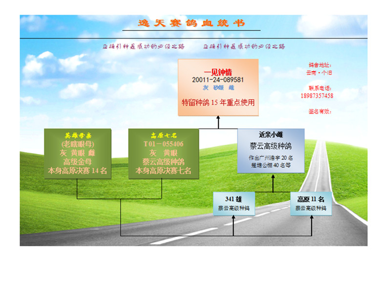 为了逸天,泪水、汗水加薪水, 终有一天,成功、胜利与收获! 本赛鸽自09年重新参赛以来,虽没有惊人的成绩,但没让我输的太惨。 本鸽舍种鸽不多,着力培养三路鸽系,凑一下美称为:“非凡家族、经典家族、惊奇家族”。每年使出六、七羽种雄,出五十羽左右幼鸽,送公棚十羽上下,每季(春秋两季)十多羽地方赛,工薪阶层嘛,养不起太多!还自我标榜叫:精品战略。 本鸽主争取55退休,但还没有老态邋遢,喜欢学习与思考,偶尔在中信网上发点感悟、日记、杂文什么的,还常被编辑看好,常在首页、焦点展示展示,不知是否丢人!哈、、 诚实、有善是我本性,热情、好客是妈妈教的,认真、执着是三十多年形成的工作风格,若天下鸽友不讨厌这样的我,欢迎多多指导、交流--(电话)-微信:13987357458。