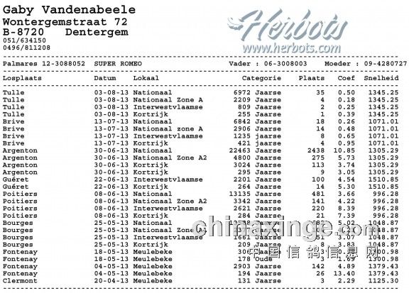 亚精顿 国家赛 一岁鸽组22463羽2438名 国家赛A2区 一岁鸽组4800羽275名 Kortrijk 一岁鸽组3024名 Kortrijk 一岁鸽组295羽9名
