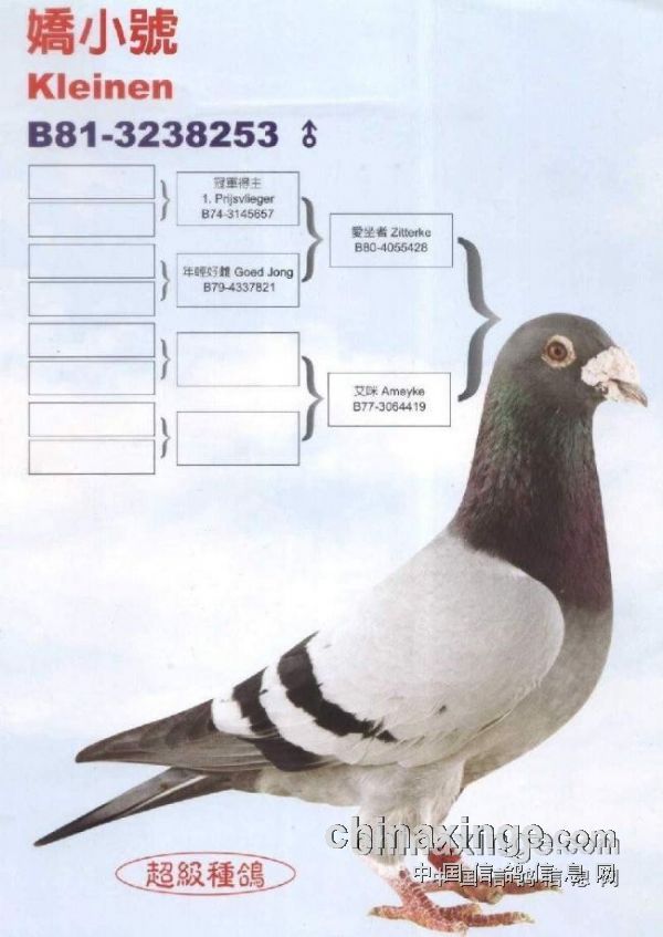 一、白腹号(Wittenbuik)B88-3206112灰色公鸽,骄小号直子,曾获冠军十二次、亚军六次,是一羽超级赛鸽,亦是继骄小号之后的黄金种公,下代入赏无数。